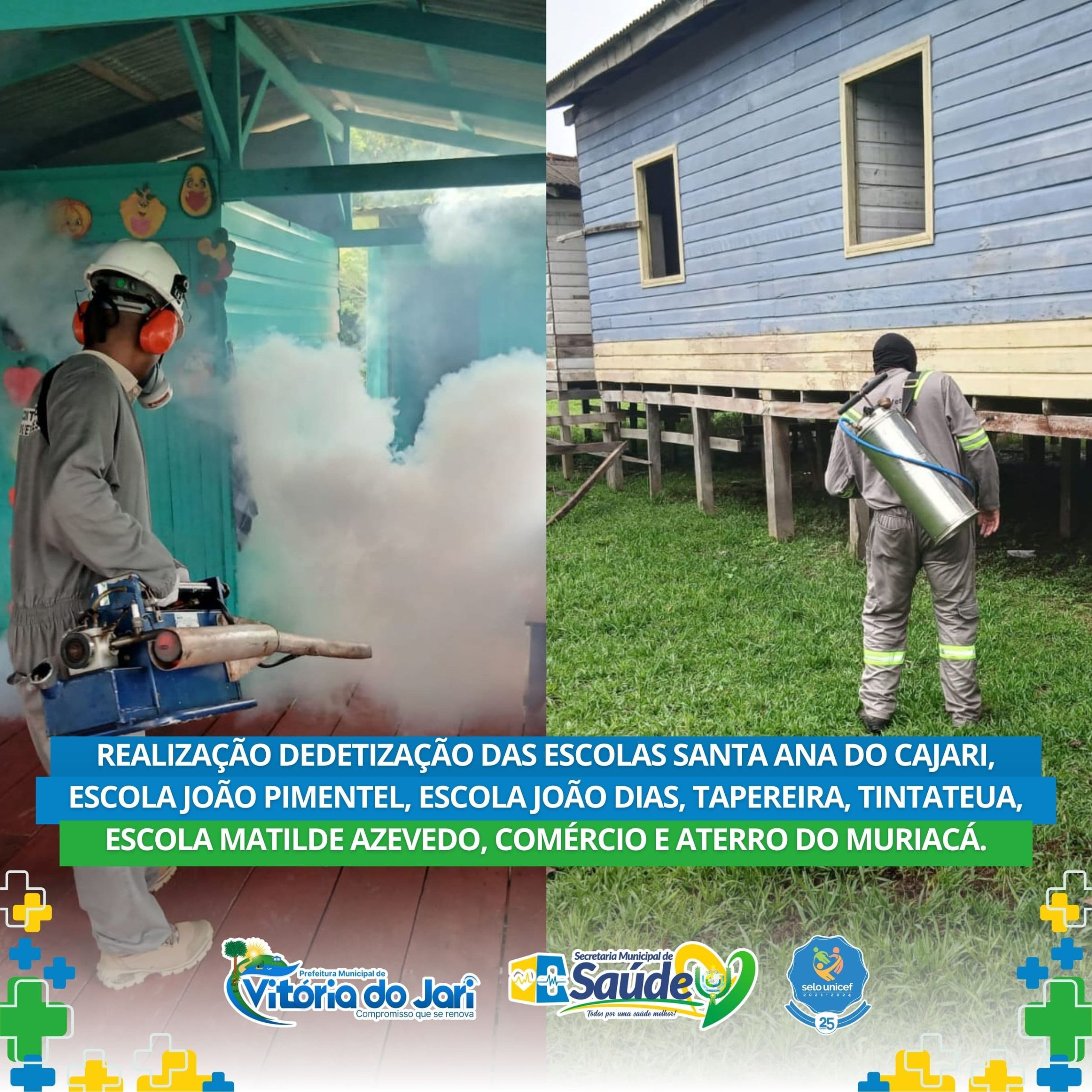 Nos dias 05, 06 e 07 de março a equipe de Vigilância Ambiental esteve realizando a dedetização das escolas Santa Ana do Cajari, Escola João Pimentel, Escola João Dias, Tapereira, Tintateua, Escola Matilde Azevedo, Comércio e aterro do Muriacá. O intuito da dedetização é eliminar e previnir o ambiente escolar quanto a infestações de pragas urbanas como( cabas, cupim, mosquito, formigas, ratos…) deixando o ambiente escolar mais protegido.